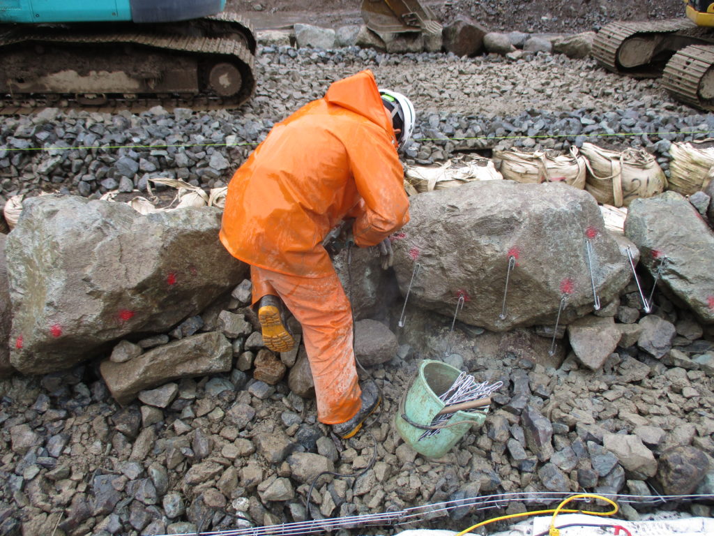 本事業の石積護岸には、当社独自のアンカービオストーン工法が採用されています。