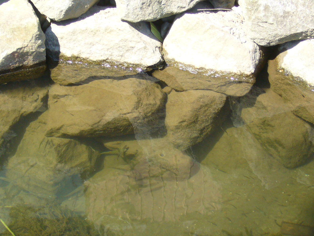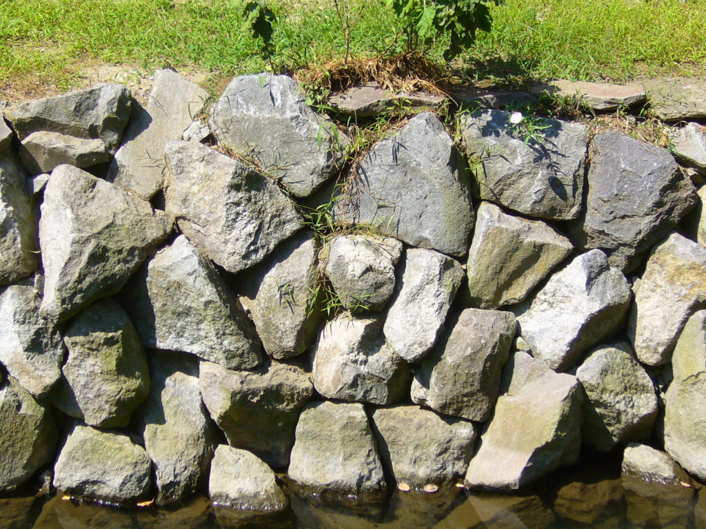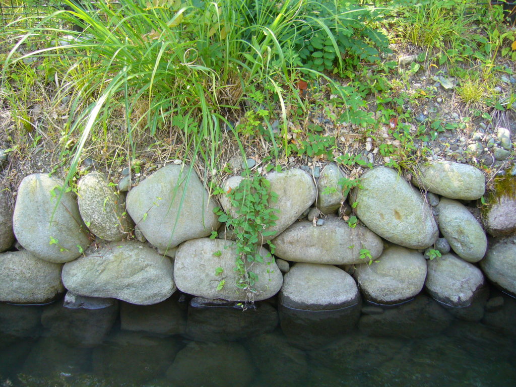 今回の改修では、自然環境への影響を最小限に抑えながら、用水路沿いに生育する植物や周辺の生態が早期に回復できる護岸づくりを目指し、当社の アンカービオストーン工法(背面ネット一体型構造) が採用されました。従来の空石積みが持つ柔らかな景観をそのままに、石材背面にアンカーを打ち込み背面ネットと一体化させることで強度と安定性を確保した当社独自の石積工法です。