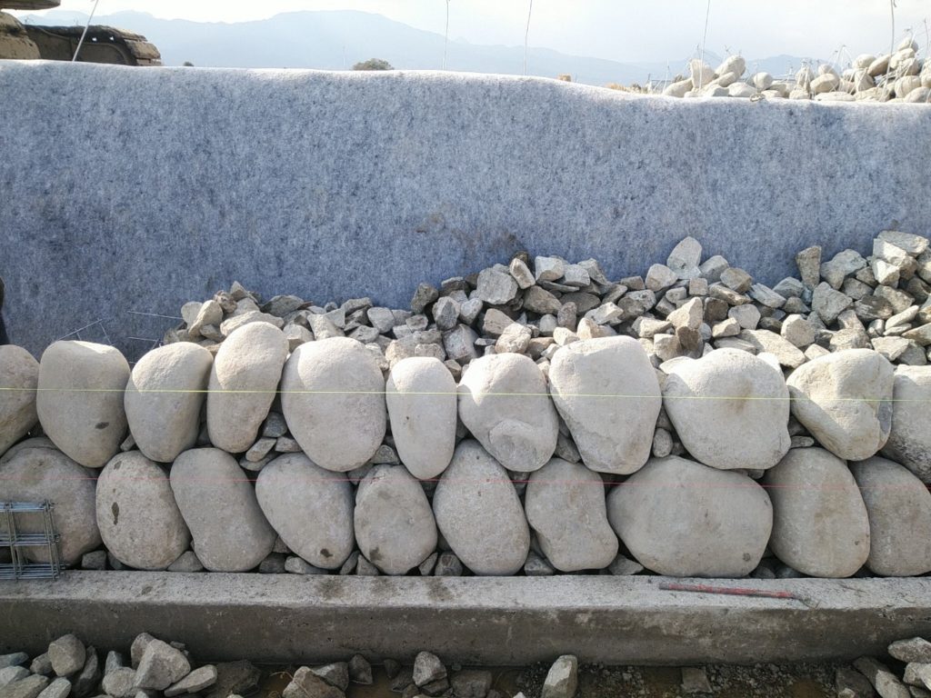 熟練技術に頼らずとも均一で美しい石積表現が可能で、裏込めコンクリートを使用しない構造のため、生物の営巣・植生回復など自然環境との調和にも寄与します。伝統的な空石積みの佇まいと、高耐久・高施工性を兼ね備えた当社オリジナル工法として、農業用水路の景観・機能性の向上に貢献しました。