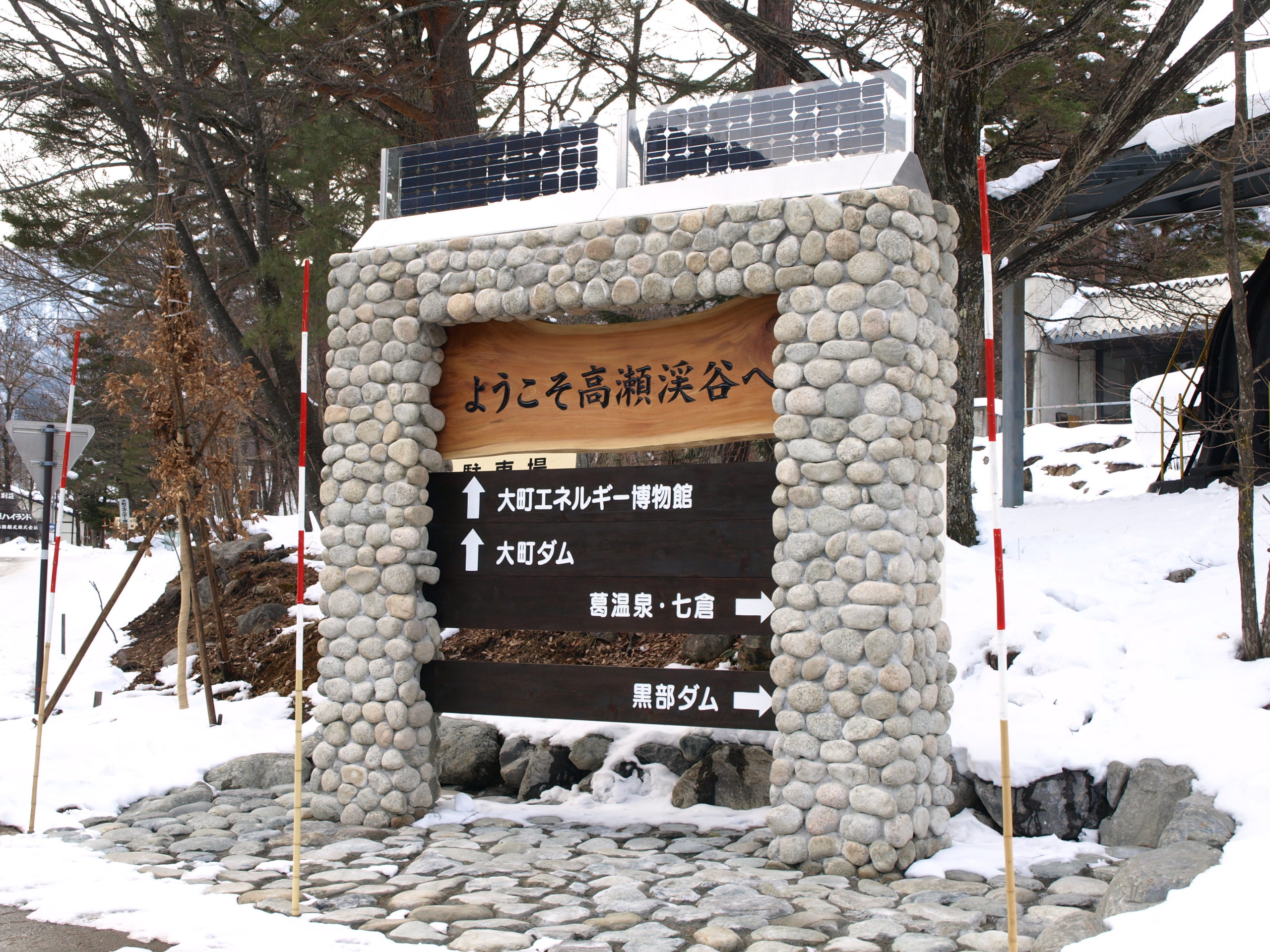 渓谷の入り口付近に設置された観光案内板には、当社独自の石積み工法である