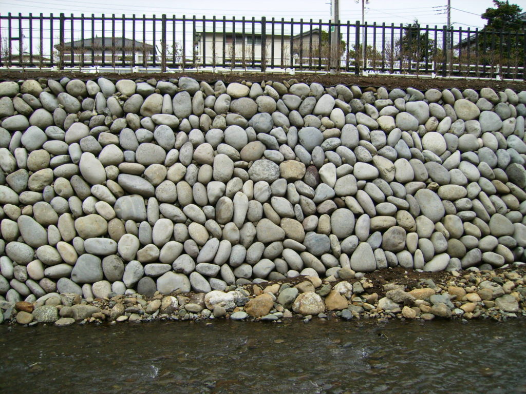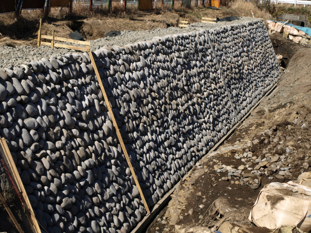 この護岸整備では、当社の アンカービオストーン工法(背面ネット一体型構造) が採用されました。従来の空石積みの自然な景観を保ちながら、背面ネットと自然石を一体化させる当社独自の技術により、高い耐久性と施工性を両立。裏込めコンクリートを使用せずに安定した護岸を形成できるため、多自然型河川整備に非常に適した工法です。