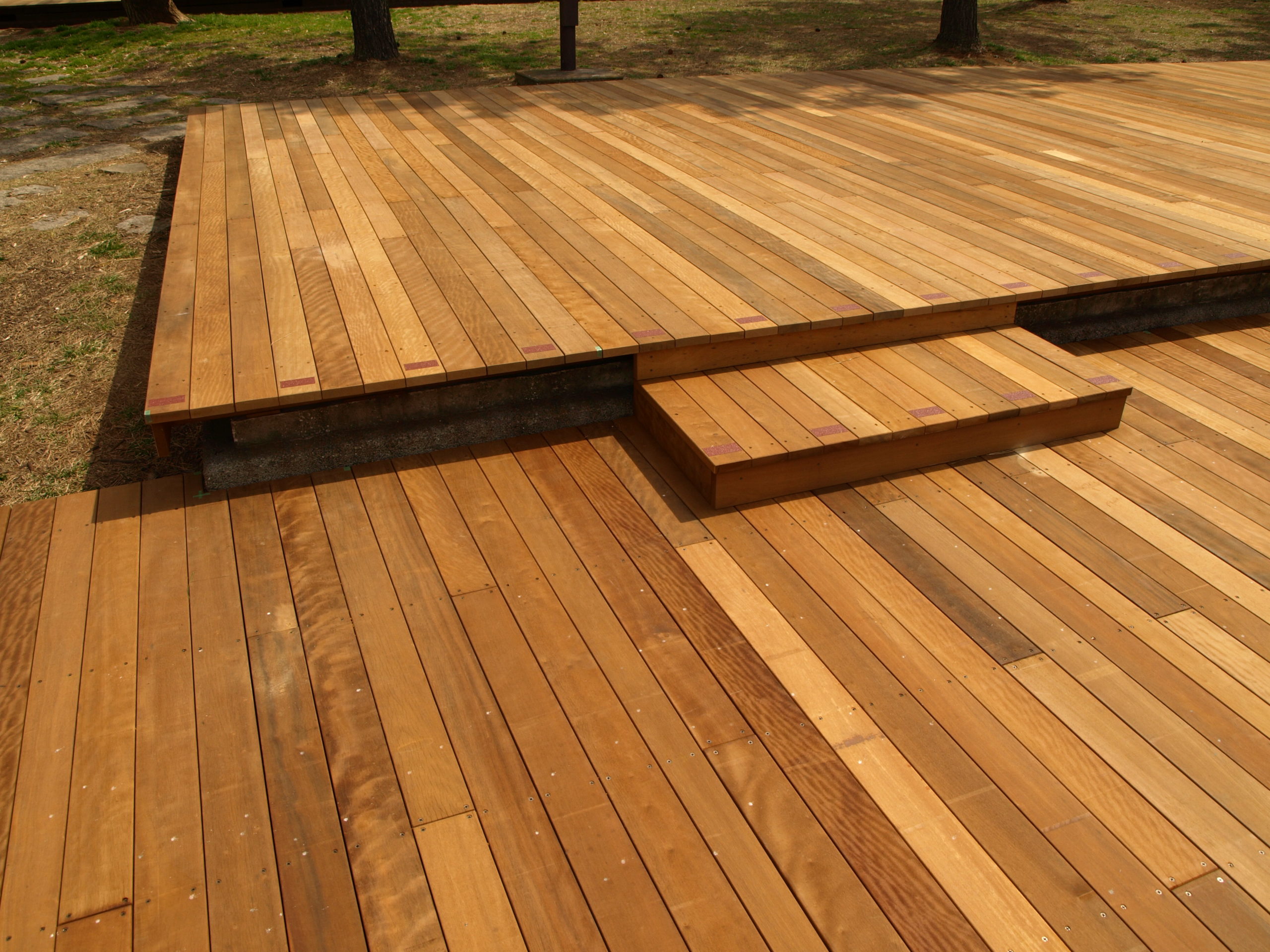 このサニーテラスのデッキには、当社の グリーンハート材 が採用されています。屋外利用においても棘やササクレが発生しないため、座る・寝転ぶ・裸足で歩く・素手で触るといった場面でも安心して利用できます。高耐久性と安全性を兼ね備えたグリーンハート材が、快適で心地よい憩いの空間づくりに貢献しています。