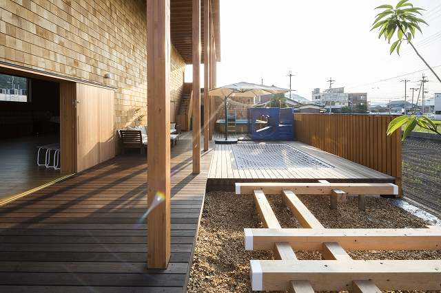 屋外床材には、当社の高耐久性木材グリーンハート材が採用されています。