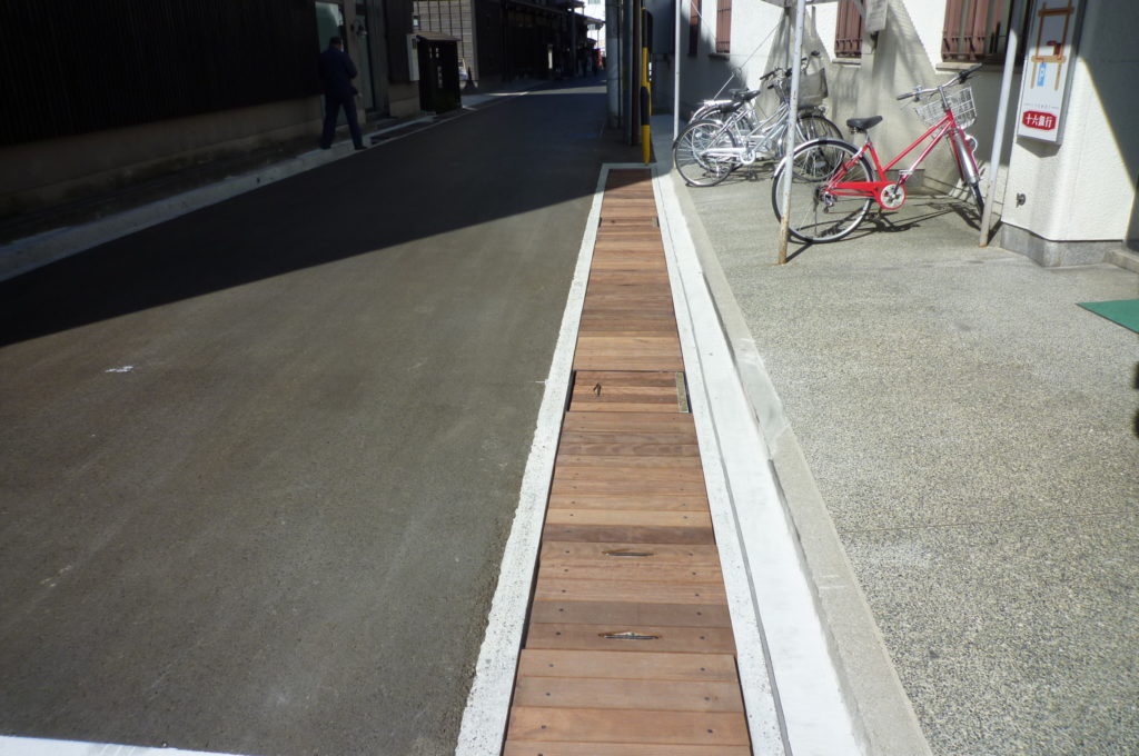 景観を損なわず安全性を高めるため、側溝蓋を木材で整備することになりましたが、一般的な木材は数年で腐朽してしまい、逆に危険を招く恐れがあります。