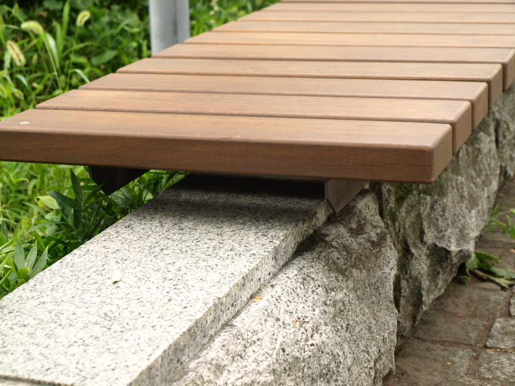 グリーンハート材は耐久性・耐水性に非常に優れ、屋外の公共空間でも長期間安心して使用できる木材です。落ち着いた質感と重厚感があり、都市景観の中でも自然材として温かみを演出します。
