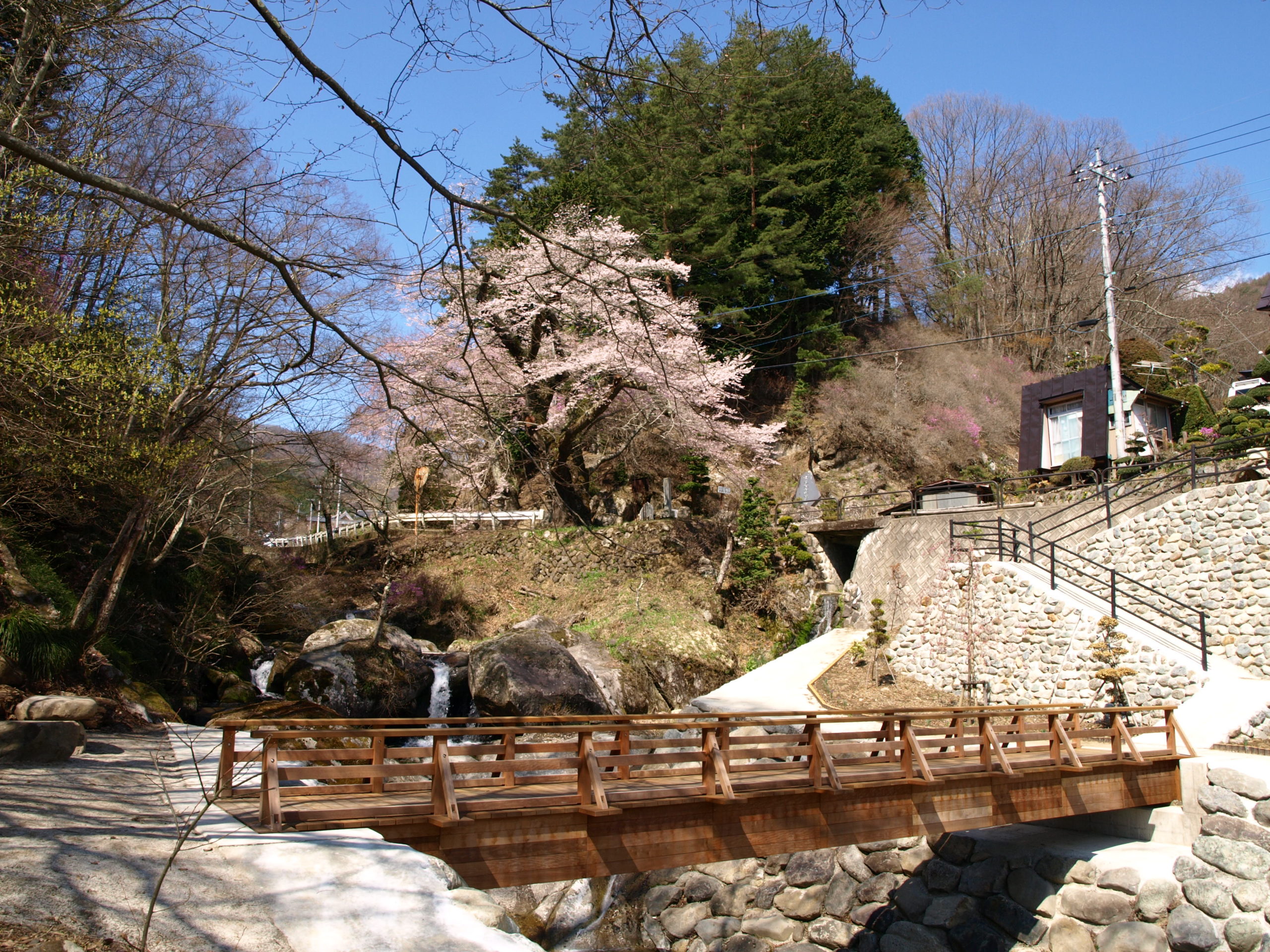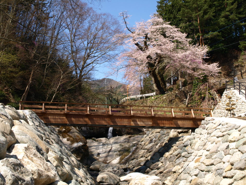 当社は、この天王桜のそばを流れる赤芝川に架かる木橋へ、高耐久性木材「グリーンハート」材を納入しました。