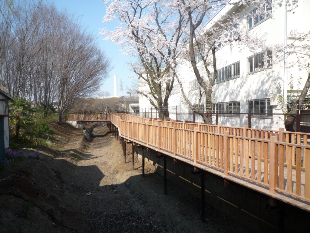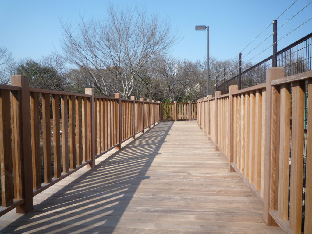 当社が手がけた黒目川デッキでは、高耐久性木材グリーンハート材を採用しています。一部のデッキは川にせり出すように設置されており、常に水に近い環境でも長寿命を保つ必要があるため、耐水・耐塩性に優れるグリーンハート材は最適です。防虫・防腐処理が不要で、腐食の心配がほとんどなく、歩行者に安心して利用していただけるデッキ空間となっています。