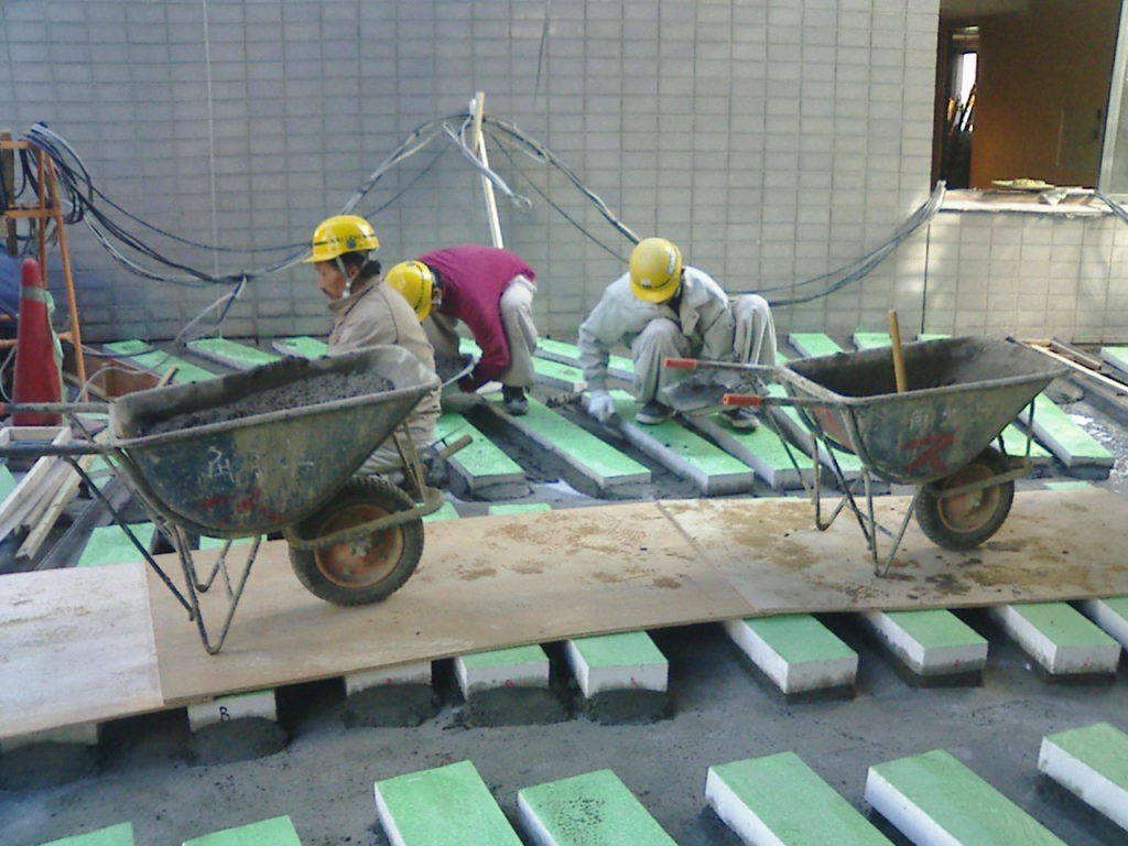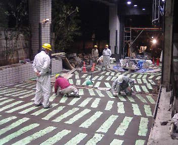 当社は、このプロジェクトの中でも特に印象的なエントランス舗装部分の施工を担当しました。表情豊かな白色のコンクリート平板は仕上がりが非常に重要であるため、施工中の汚れや傷を防ぐための徹底した養生を実施し、デザイン性と品質を両立した仕上がりとなっています。
