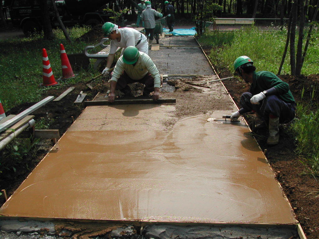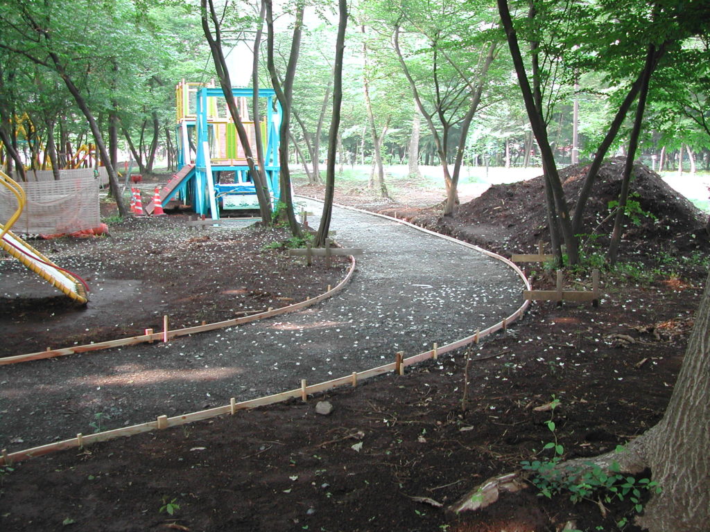 園内の歩道にはSKソイルが採用されました。自然の土に見える質感を持ちながら、雨天時でもぬかるまず、遊具周辺の土のエリアと歩行者動線を快適につなぐ舗装として活用されています。