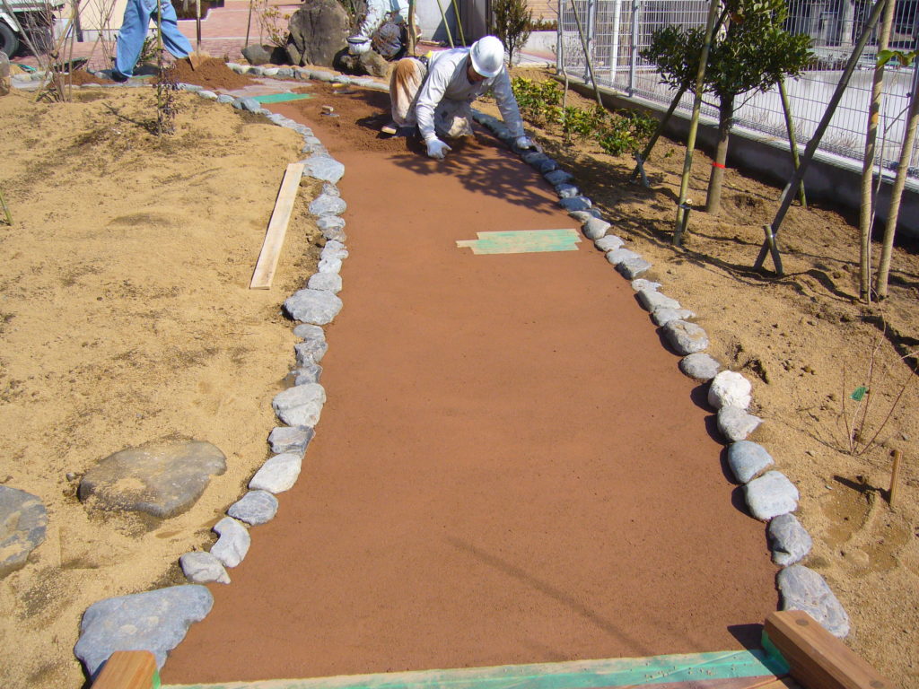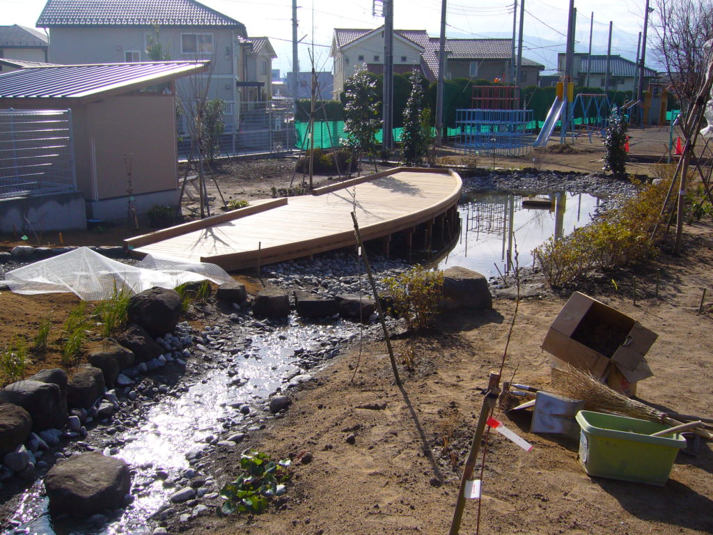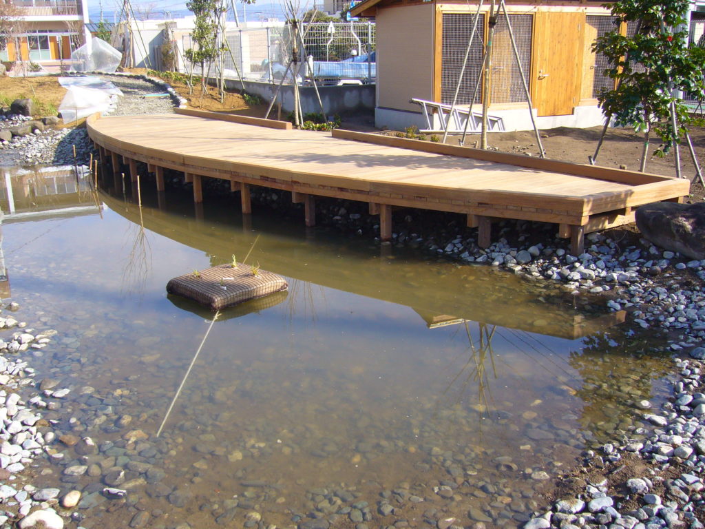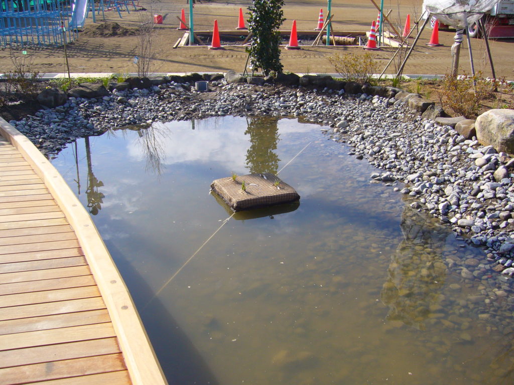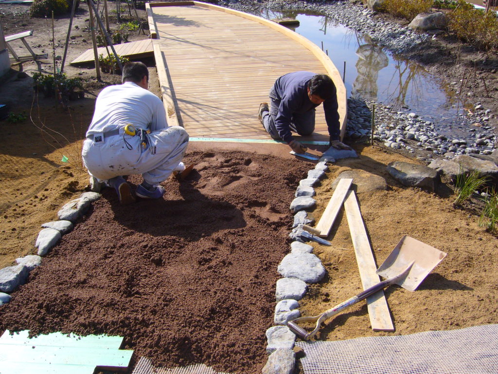 ビオトープ内の園路には当社のSKソイルが採用されています。土系舗装のため自然景観を損なわず、周囲の植栽や水辺の雰囲気にもよく馴染みます。また、雨天時でも泥濘みになりにくく、学習や観察活動を安全に行うことができます。