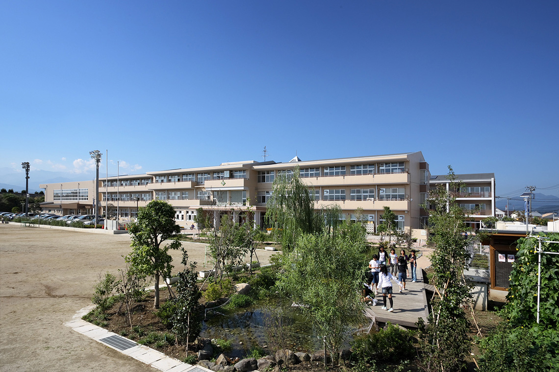 昭和59年に開校した西城小学校は、木材を多く使った温かみのある校舎や広々とした校庭、生き物の環境を身近に感じられるビオトープ、町並みや周囲の山々を見渡せる展望室などを備えたエコスクールです。