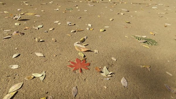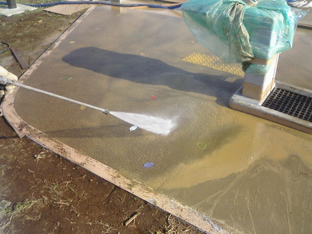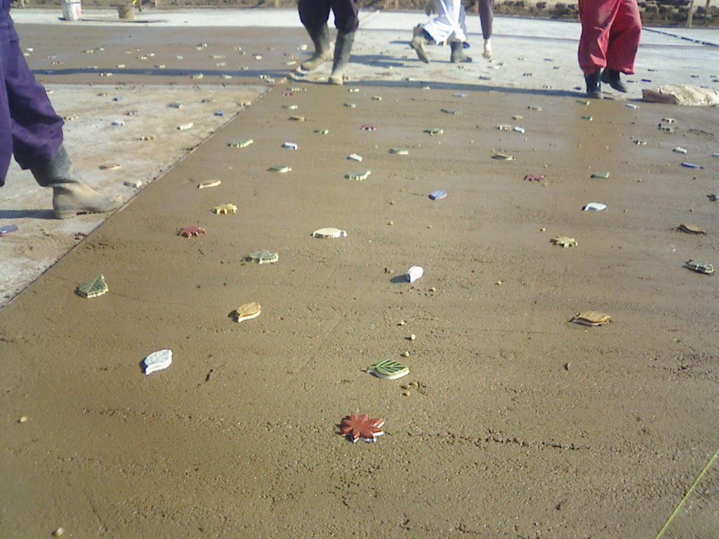 当社の洗い出し工法は、常設トイレ前の小広場の舗装に採用されました。今回は“遊び心のある舗装”をテーマに、グレー系の落ち着いたモルタルに、粒径の小さな白・ピンク系の骨材をミックス。さらに赤・黄・緑の落葉タイルを散りばめることで、落ち着いた色合いの中にアクセントが映えるデザインに仕上げています。さりげない装飾ながら、訪れる人が足を止めたくなるような温かみのある広場になっています。