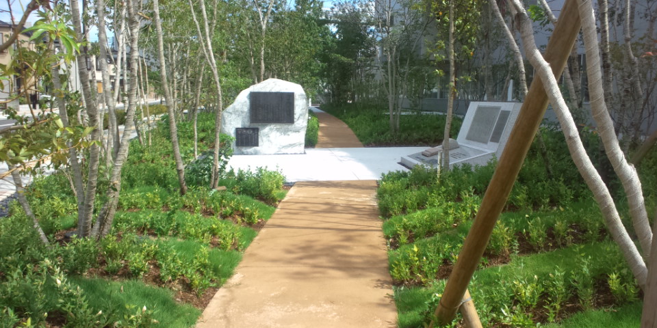 さらに、西側の雑木林内に移設された 「非核平和都市宣言碑」(1988年制定) の周囲にも、白色の研ぎ出し舗装が採用されています。