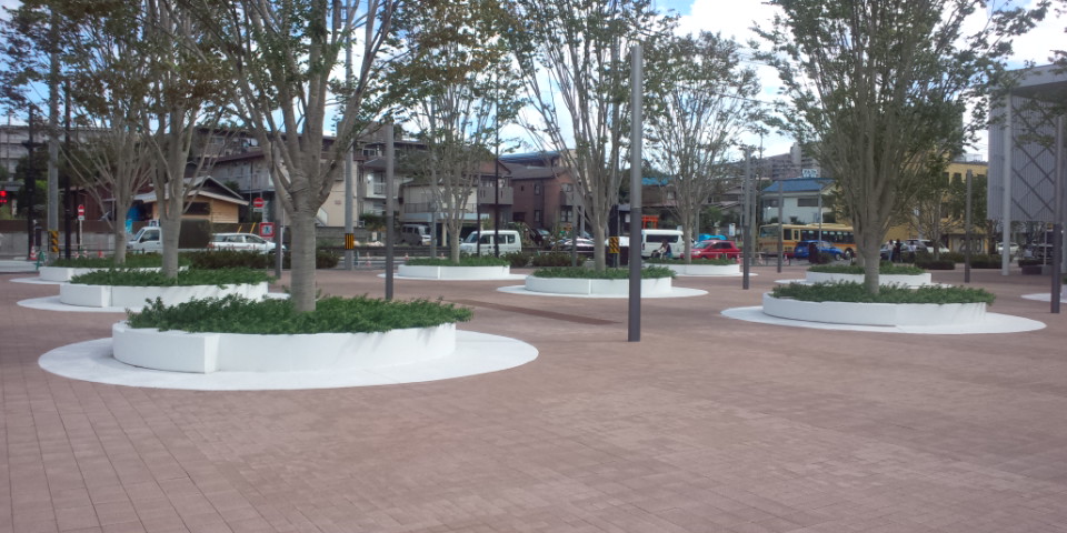 町田市新庁舎では、SKソイルに加えて 研ぎ出し仕上げ によるベンチおよび舗装部分も施工しています。