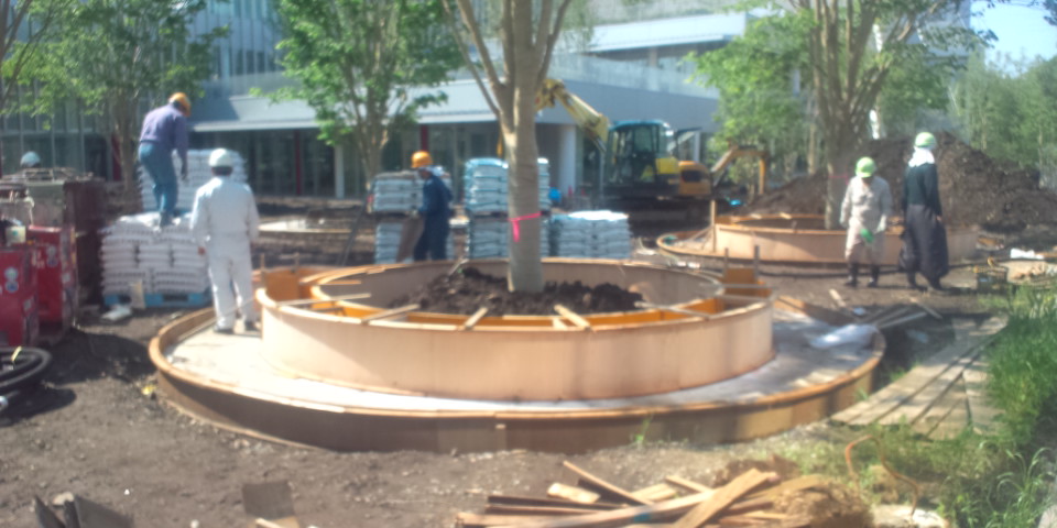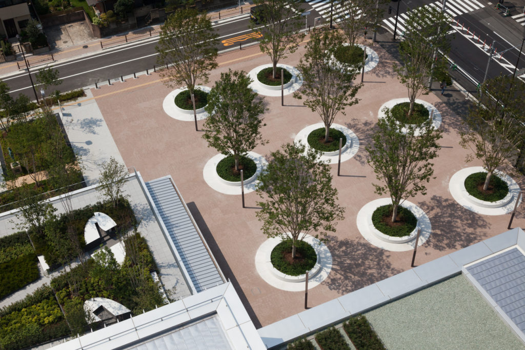 - 植栽を囲むように設計された 円形ベンチ に使用