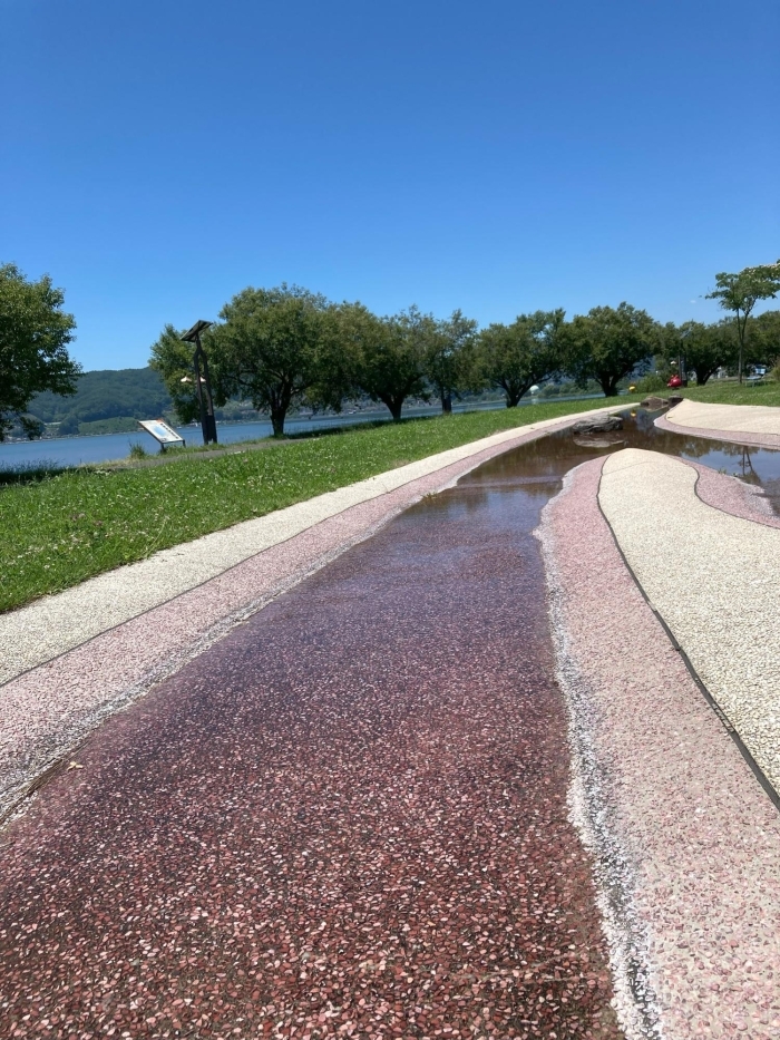 明るい赤系カラーで仕上げることで、夏の日差しの下で青空や緑の芝生がより鮮やかに際立ち、季節感あふれる美しい景観が楽しめます。沙浜のように優しい雰囲気もあり、親水空間として心地よい空間づくりに貢献しています。