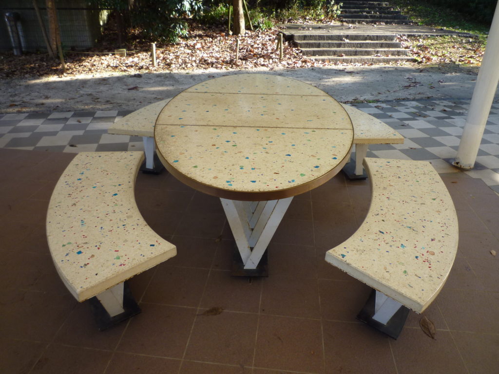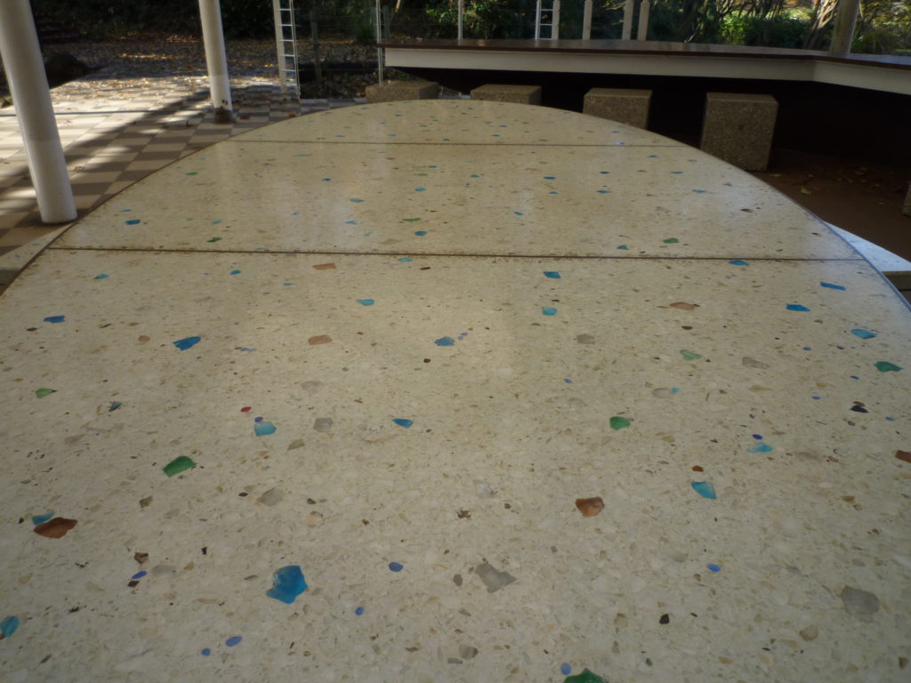 休憩スペースの机とベンチには、当社の研ぎ出し工法を採用しています。研ぎ出しは、骨材入りモルタルを硬化後に研磨して骨材を露出させるため、つるっとした滑らかな仕上がりが特徴です(洗い出しとは異なり、表面を磨く仕上げ)。